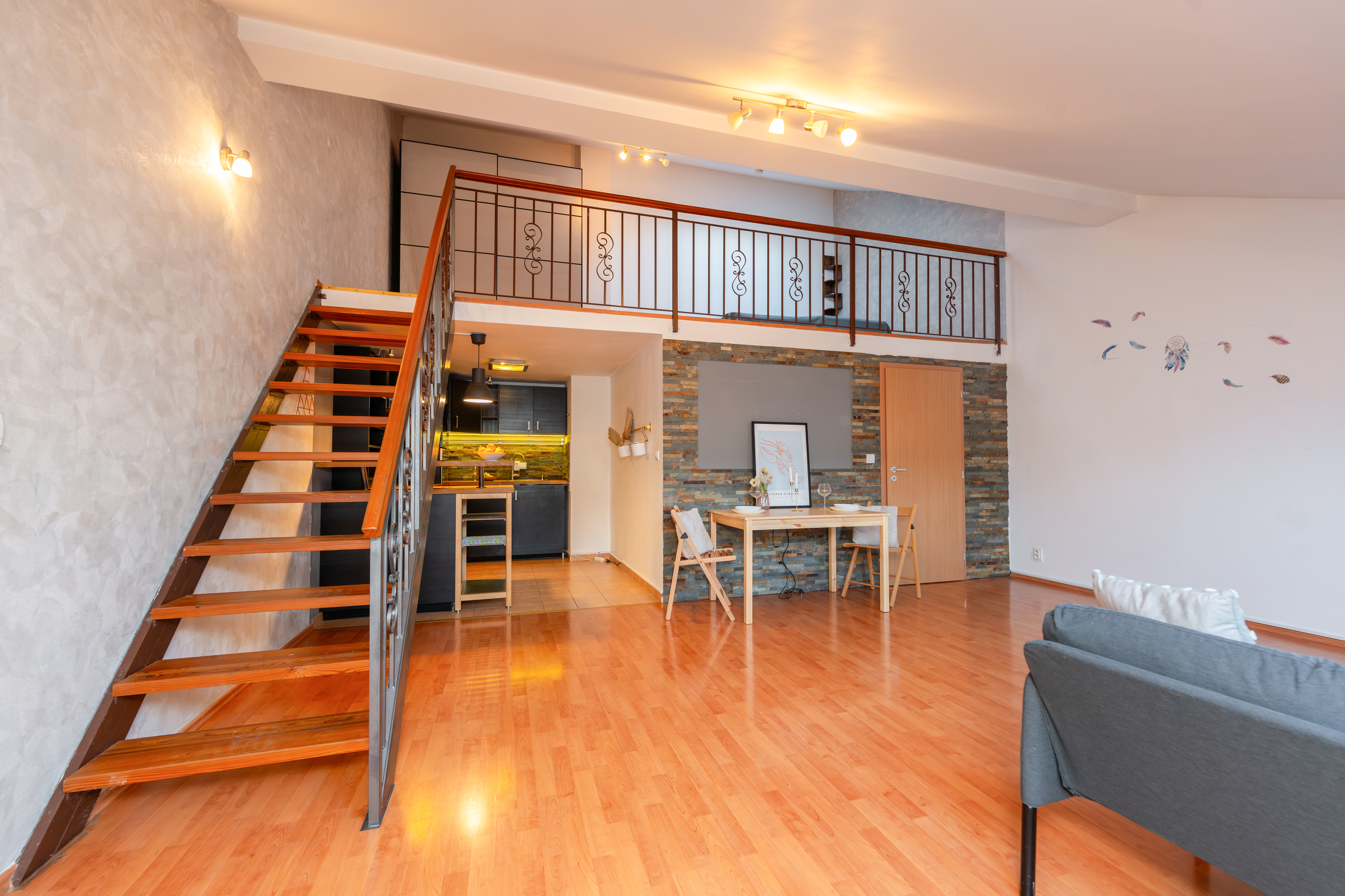 Byt je aktuálně dispozičně řešen jako prostorné 1+kk s mezonetovým patrem, přičemž díky svému uspořádání nabízí velmi snadnou úpravu na plnohodnotné 2+kk. Jednoduchým doplněním lehké příčky lze oddělit spací část a vytvořit tak samostatnou ložnici bez zásahu do nosných konstrukcí. Spodní patro tvoří otevřený obývací prostor s kuchyňským koutem, který působí velmi vzdušně a příjemně prosvětleně. Dále se zde nachází koupelna se sprchovým koutem a toaletou.