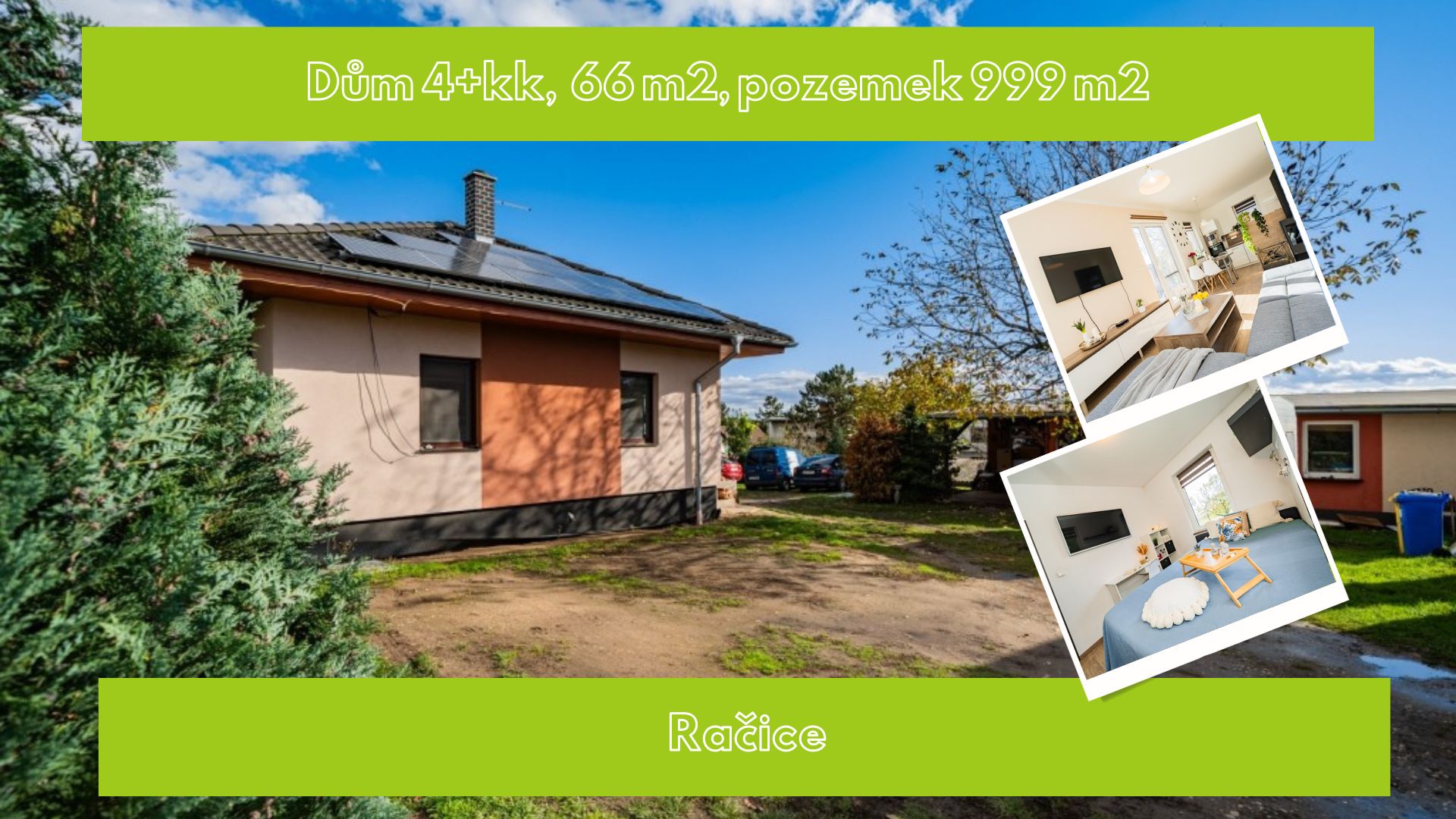 Hledáte moderní nízkonákladové bydlení a k tomu „druhý prostor“ navíc? Nabízíme zděný bungalov 4+kk (2020) na pozemku 999 m² v obci Račice u Štětí. Součástí prodeje je také samostatný zateplený mobilheim cca 50 m² – ideální pro hosty, pracovnu, zázemí pro rodinu nebo případně pronájem.